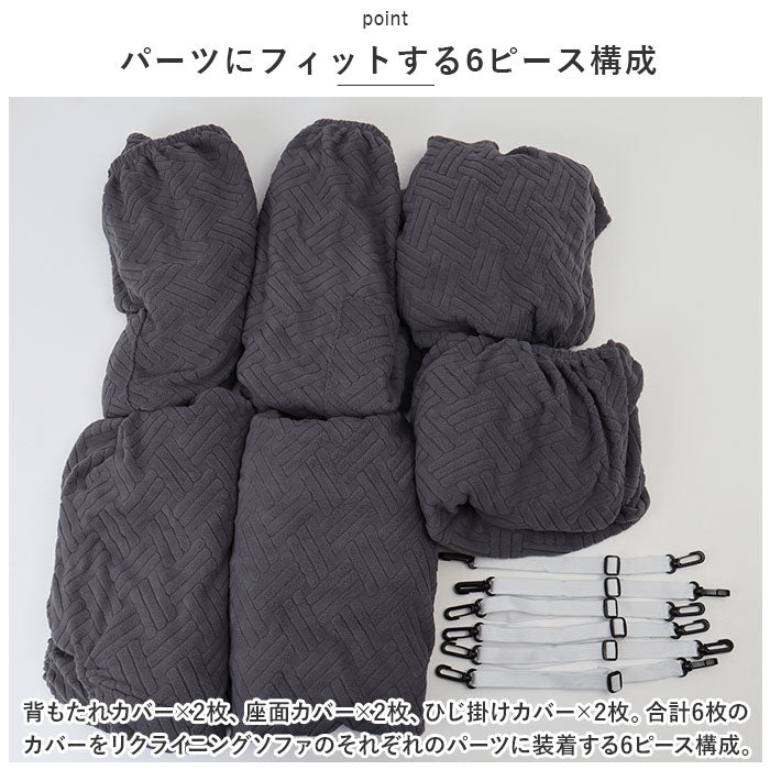 ・背もたれカバー×2枚、座面カバー×2枚、ひじ掛けカバー×2枚。合計6枚のカバーをリクライニングソファのそれぞれのパーツに装着する6ピース構成。