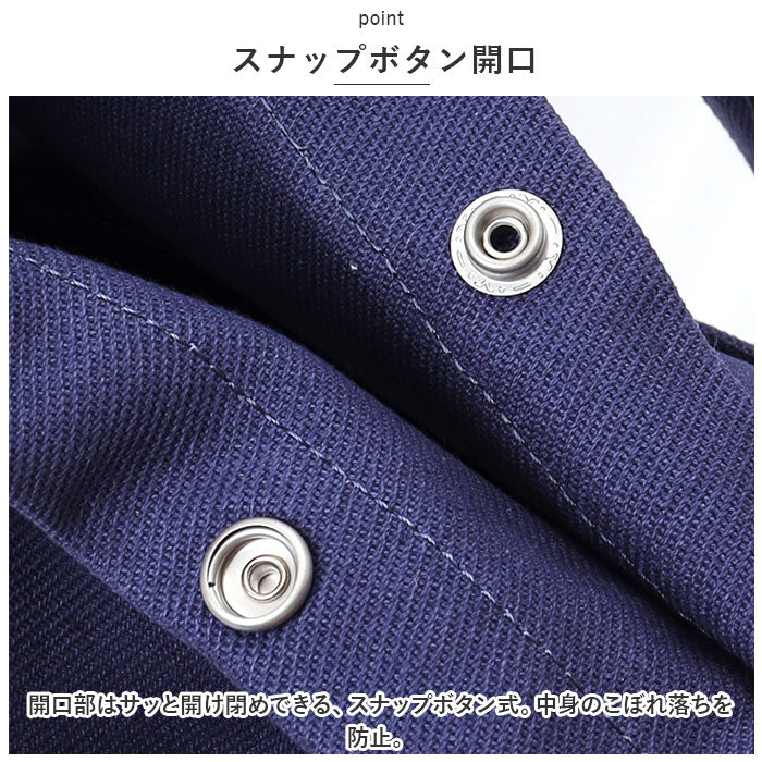 ・開口部はサッと開け閉めできる、スナップボタン式。中身のこぼれ落ちを防止。