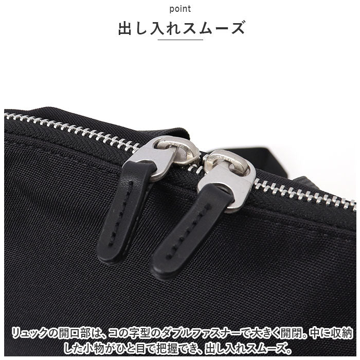 ・リュックの開口部は、コの字型のダブルファスナーで大きく開閉。中に収納した小物がひと目で把握でき、出し入れスムーズ。