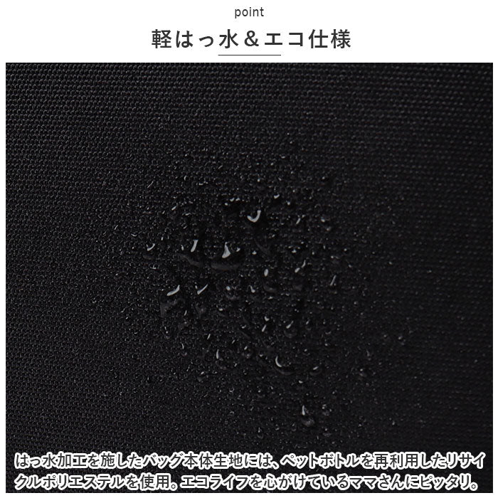 ・はっ水加工を施したバッグ本体生地には、ペットボトルを再利用したリサイクルポリエステルを使用。エコライフを心がけているママさんにピッタリ。