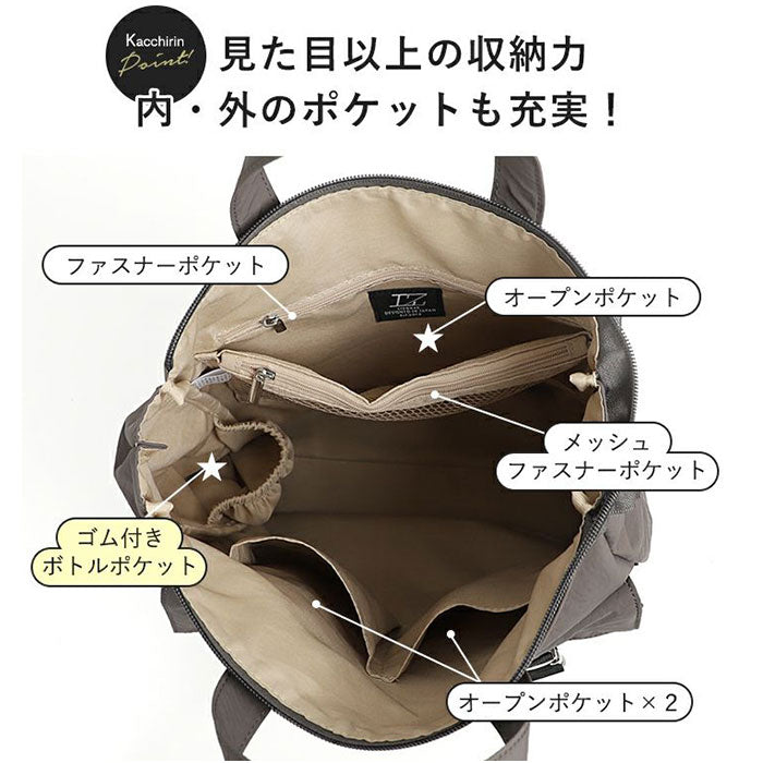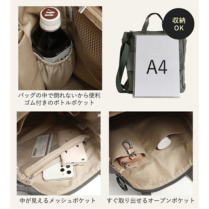・A4がすっぽり。程よいマチで、ポーチやドリンクボトルなどお出かけに必要な荷物が1つに。
