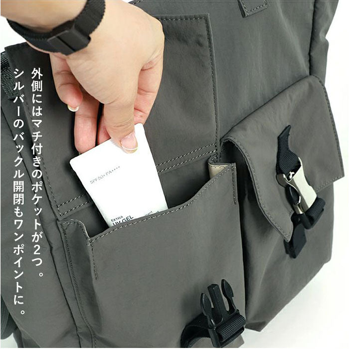 ・前面:バックル付きフラップポケット×2