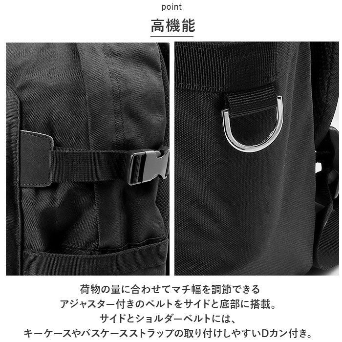 ・荷物の量に合わせてマチ幅を調節できるアジャスター付きのベルトをサイドと底部に搭載。荷物の量が少ない時はスマートな見た目に。