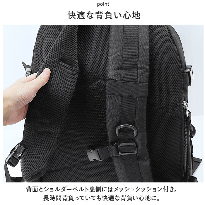 ・背面とショルダーベルト裏側にはメッシュクッション付き。長時間背負っていても快適な背負い心地に。