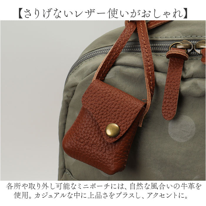 ・各所や取り外し可能なミニポーチには、自然な風合いの牛革を使用。カジュアルな中に上品さをプラスし、アクセントに。