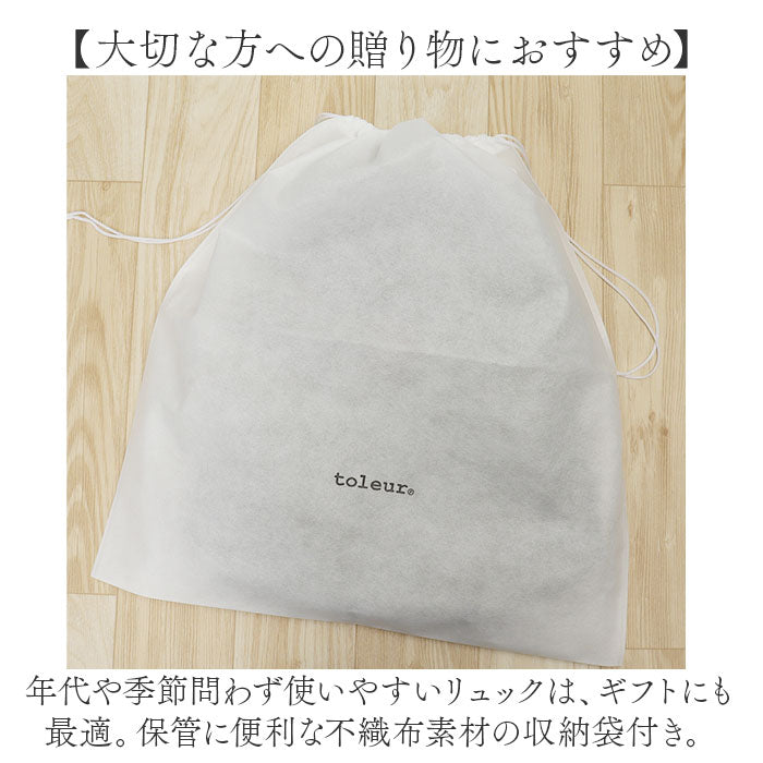 ・年代や季節問わず使いやすいリュックは、ギフトにも最適。保管に便利な不織布素材の収納袋付き。
