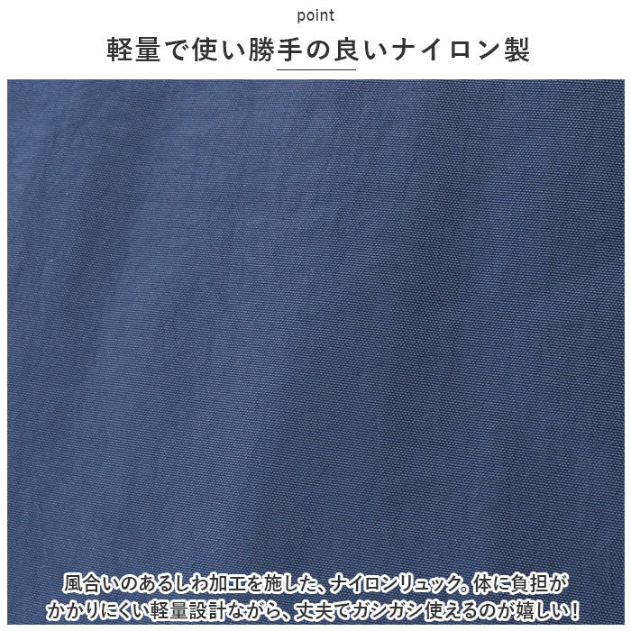 ・風合いのあるしわ加工を施した、ナイロンリュック。体に負担がかかりにくい軽量設計ながら、丈夫でガシガシ使えるのが嬉しい!