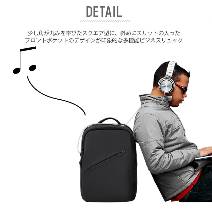 ・少し角が丸みを帯びたスクエア型に、斜めにスリットの入ったフロントポケットのデザインが印象的な多機能ビジネスリュック。