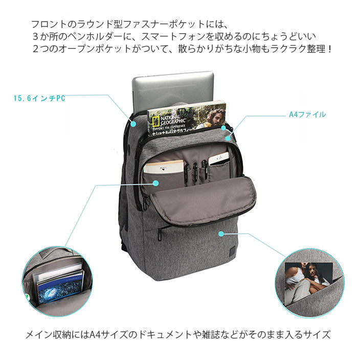 ・フロントのラウンド型ファスナーポケットには、3か所のペンホルダーに、スマートフォンを収めるのにちょうどいい2つのオープンポケットがついて、散らかりがちな小物もラクラク整理!キーケースを掛けるのにちょうどいいフックつき。