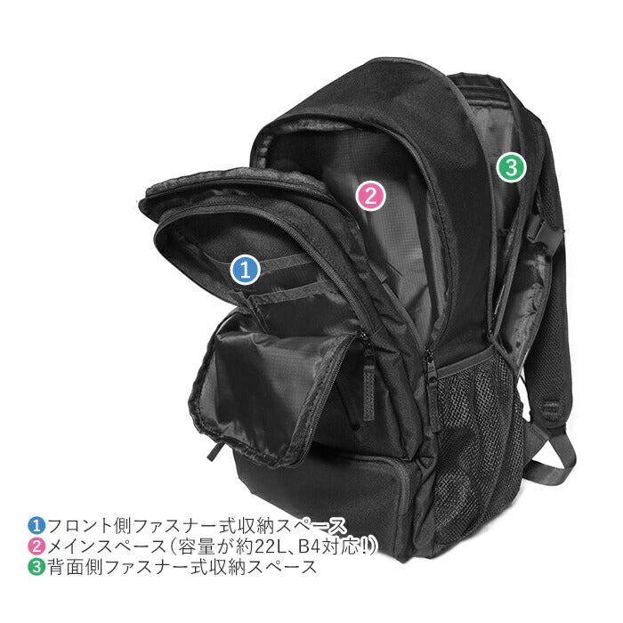 ・フロントのファスナー式収納スペースには、表側にロゴテープ付き(取り外し可能)のファスナーポケット×1、内側はマジックテープ付きポケット×1、オープンポケット×2、ペンホルダー×2で、小物整理に便利!
