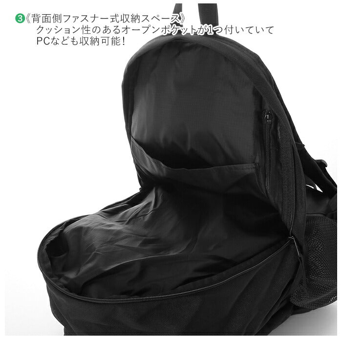 ・背面側のファスナー式の収納スペースは、クッション性のあるオープンポケットが1つ付いていてPCなども収納可能!背面ファスナーと直結していて便利♪