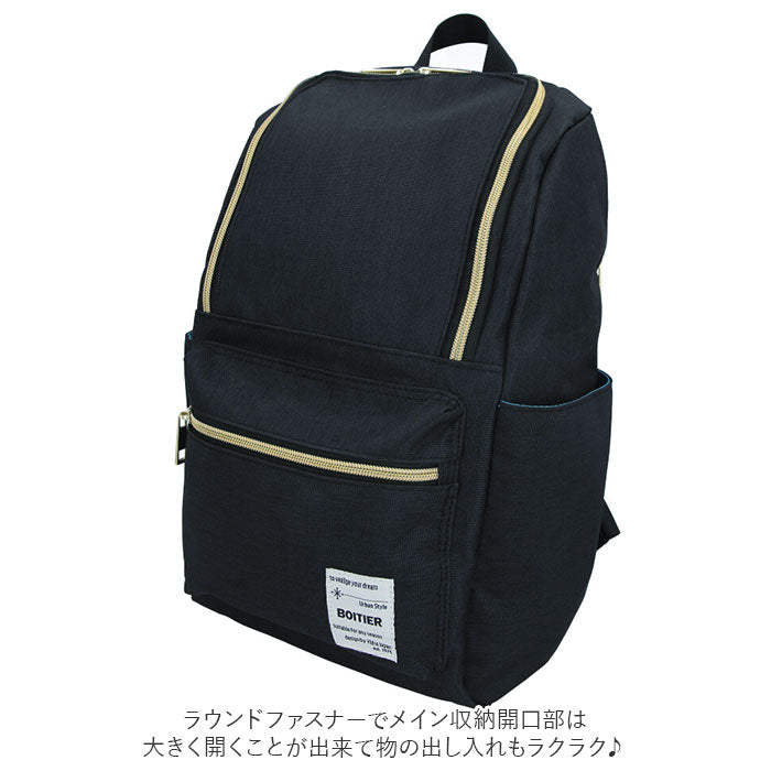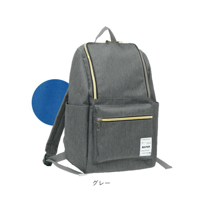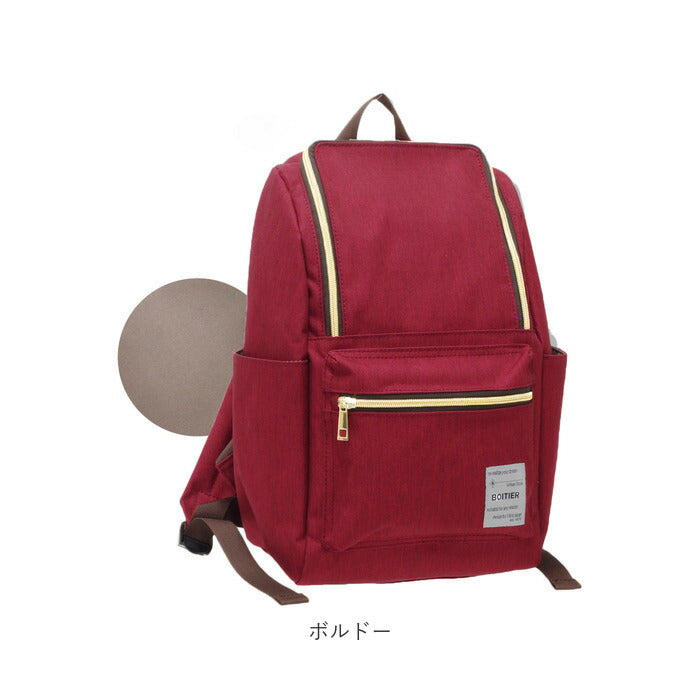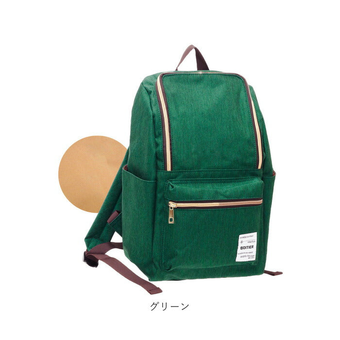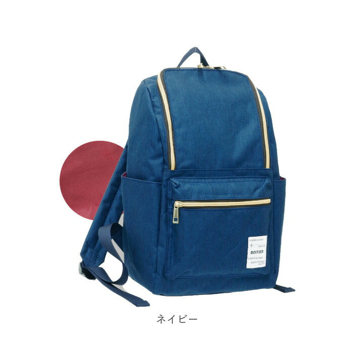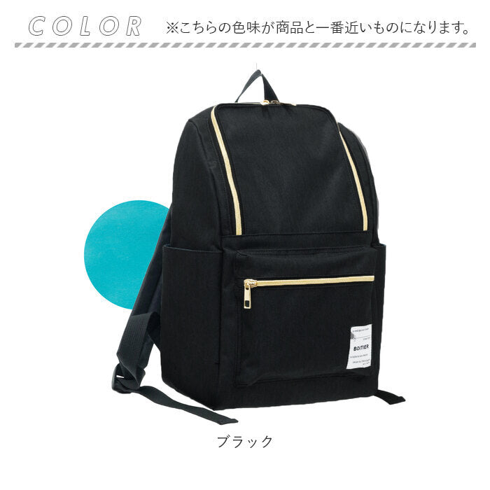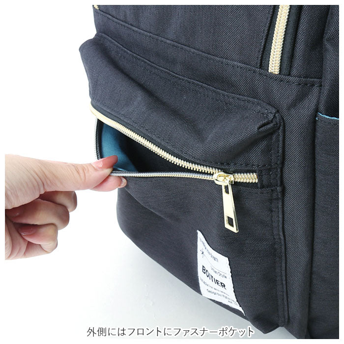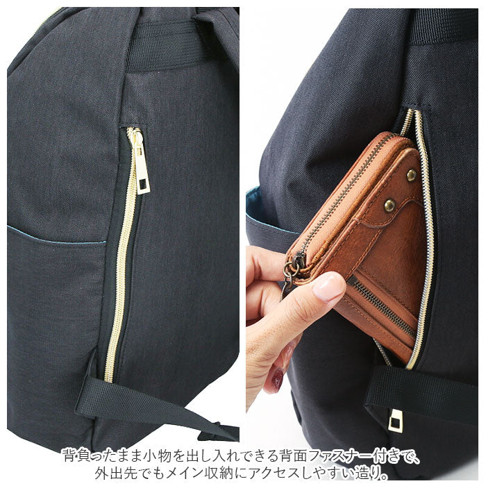 ・背負ったまま小物を出し入れできる背面ファスナー付きで、外出先でもメイン収納にアクセスしやすい造り。