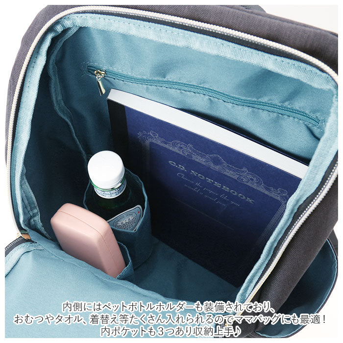 ・内側にはペットボトルホルダーも装備されており、おむつやタオル、着替え等たくさん入れられるのでママバッグにも最適!内ポケットも3つあり収納上手♪