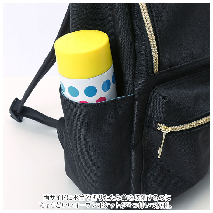 ・外側にはフロントにファスナーポケットの他、両サイドに水筒や折りたたみ傘を収納するのにちょうどいいオープンポケットが2つ付いて便利。