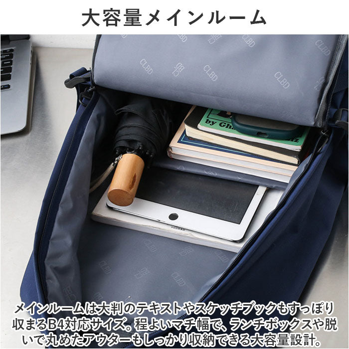 ・メインルームは大判のテキストやスケッチブックもすっぽり収まるB4対応サイズ。程よいマチ幅で、ランチボックスや脱いで丸めたアウターもしっかり収納できる大容量設計。