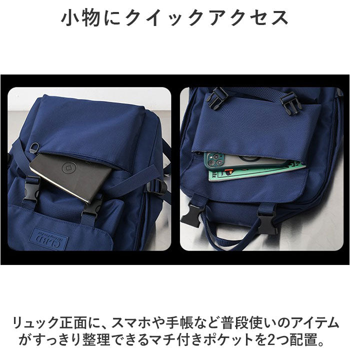 ・リュック正面に、スマホや手帳など普段使いのアイテムがすっきり整理できるマチ付きポケットを2つ配置。使いたい時にサッと取り出せるのが嬉しいポイント!