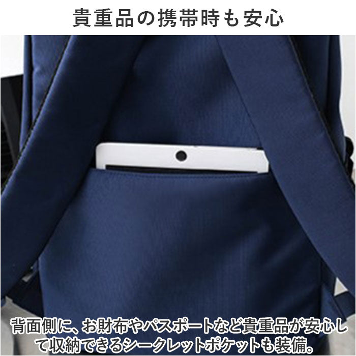 ・背面側に、お財布やパスポートなど貴重品が安心して収納できるシークレットポケットも装備。