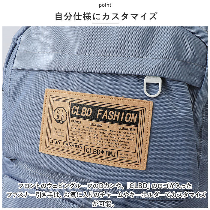 ・フロントのウェビングループのDカンや、「CLBD」のロゴが入ったファスナー引き手は、お気に入りのチャームやキーホルダーでカスタマイズが可能。