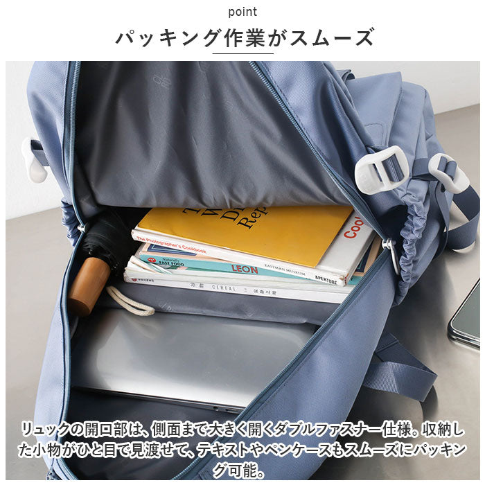 ・リュックの開口部は、側面まで大きく開くダブルファスナー仕様。収納した小物がひと目で見渡せて、テキストやペンケースもスムーズにパッキング可能。