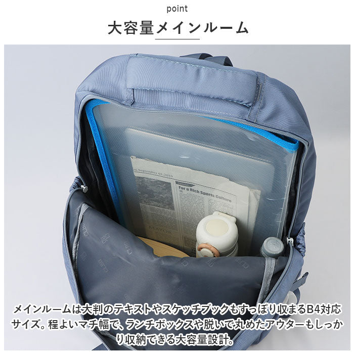 ・メインルームは大判のテキストやスケッチブックもすっぽり収まるB4対応サイズ。程よいマチ幅で、ランチボックスや脱いで丸めたアウターもしっかり収納できる大容量設計。