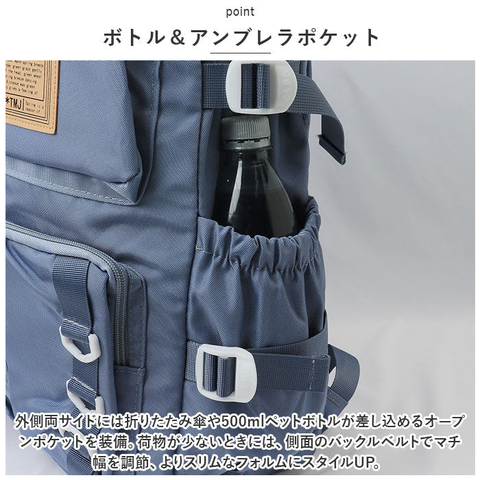 ・外側両サイドには折りたたみ傘や500mlペットボトルが差し込めるオープンポケットを装備。荷物が少ないときには、側面のバックルベルトでマチ幅を調節、よりスリムなフォルムにスタイルUP。