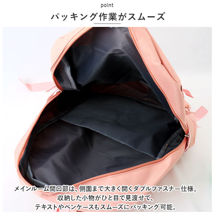 ・メインルーム開口部は、側面まで大きく開くダブルファスナー仕様。収納した小物がひと目で見渡せて、テキストやペンケースもスムーズにパッキング可能。