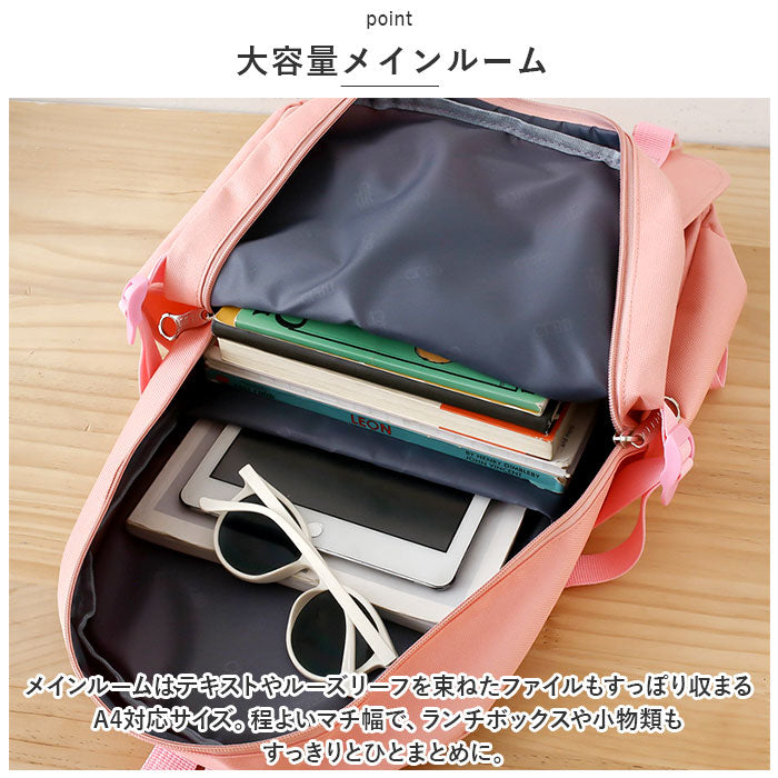 ・メインルームはテキストやルーズリーフを束ねたファイルもすっぽり収まるA4対応サイズ。程よいマチ幅で、ランチボックスや小物類もすっきりとひとまとめに。