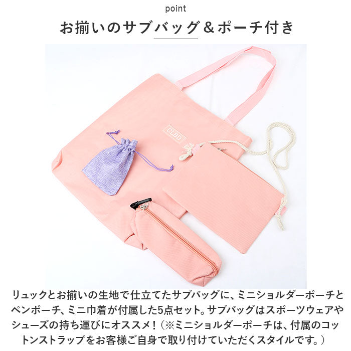 ・リュックとお揃いの生地で仕立てたサブバッグに、ミニショルダーポーチとペンポーチ、ミニ巾着が付属したお得な5点セット。サブバッグは、スポーツウェアやシューズの持ち運びにオススメ!(※ミニショルダーポーチは、付属のコットンストラップをお客様ご自身で取り付けていただくスタイルです。)