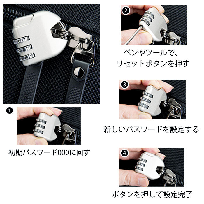 ・外出先や旅先での盗難から荷物を守る、3ケタの安全ロックが付属。
