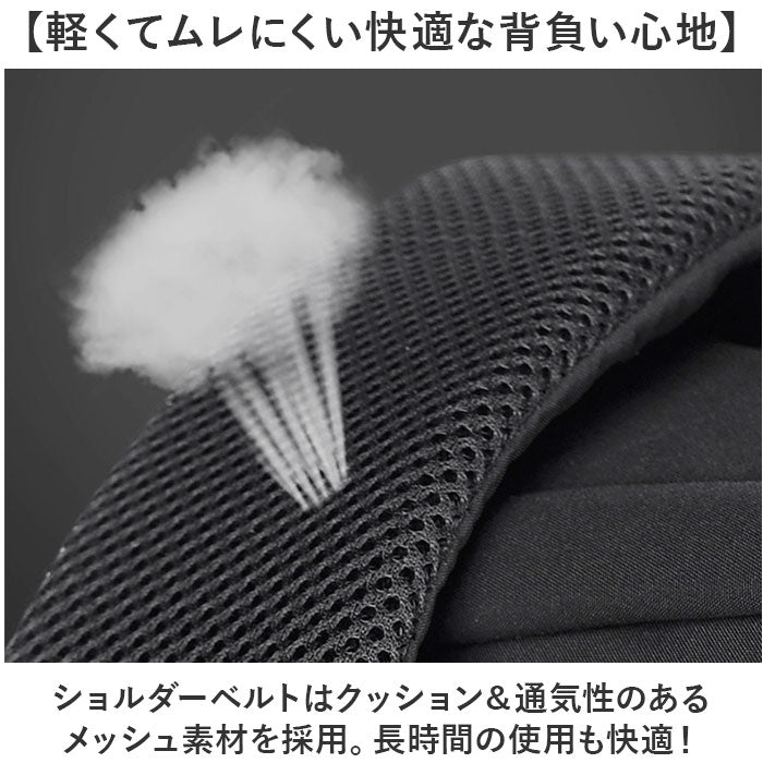 ・ショルダーベルトはクッション&通気性のあるメッシュ素材を採用。長時間の使用も快適!