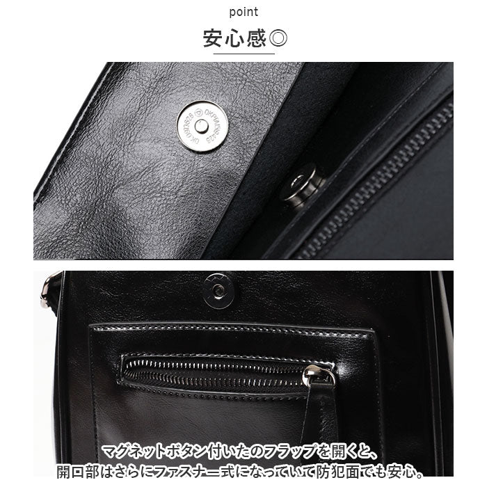 ・メインルームはB5サイズが余裕で収納でき、サイドのスナップボタンでマチ幅調整可能。多ポケットで小物の整理もしやすく、マチがしっかりあるので見た目以上の収納力。
