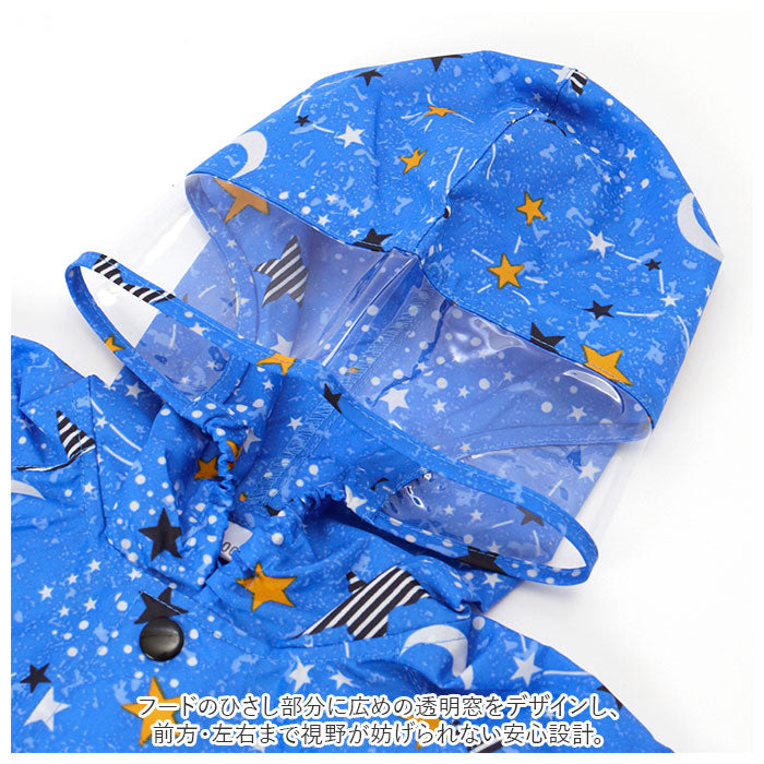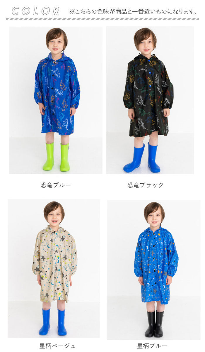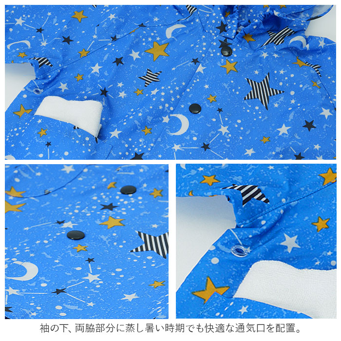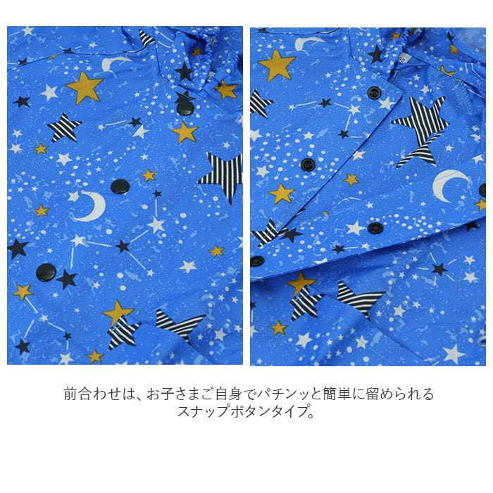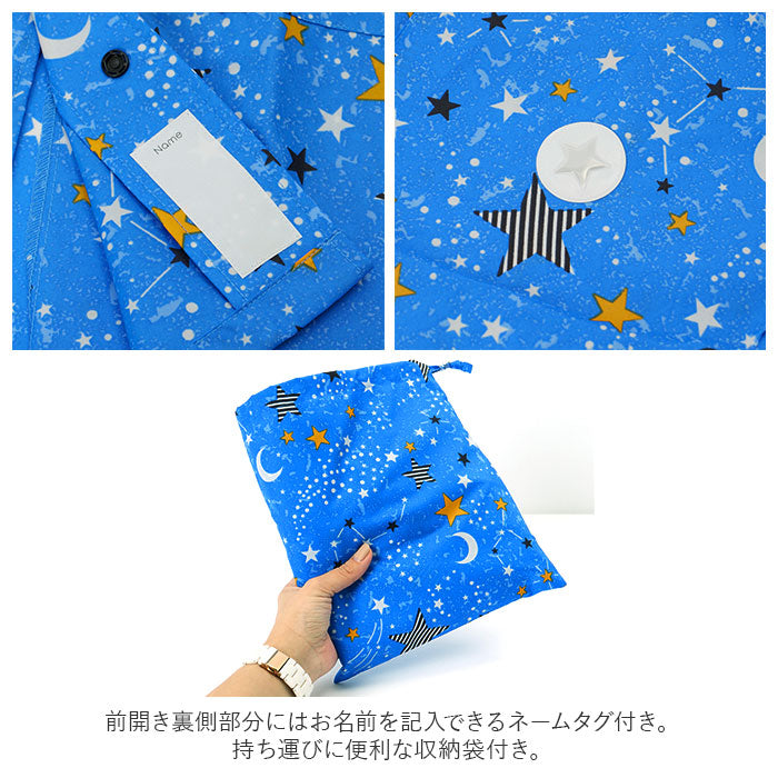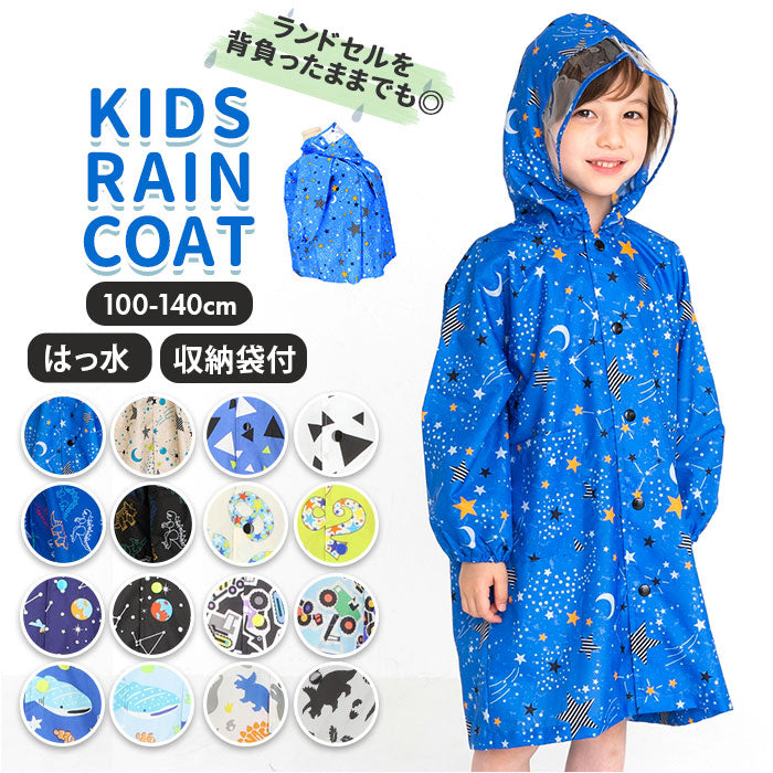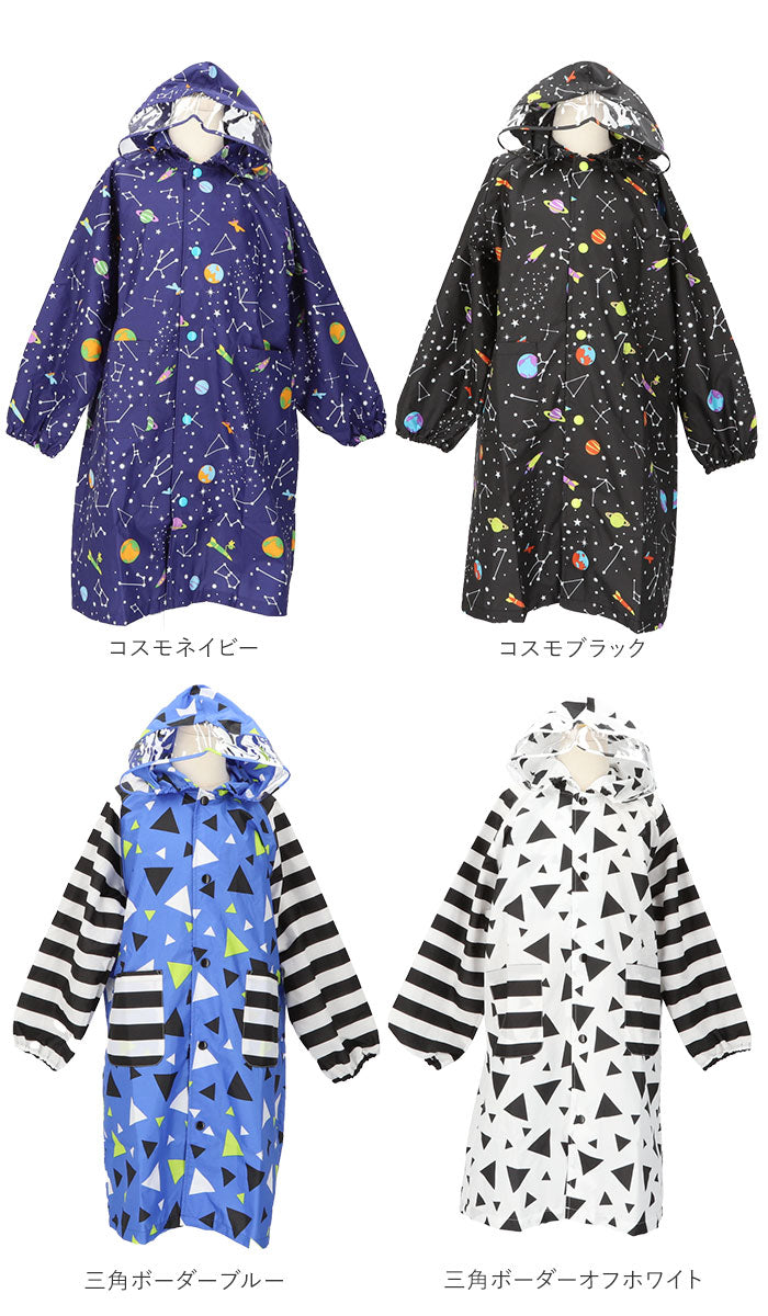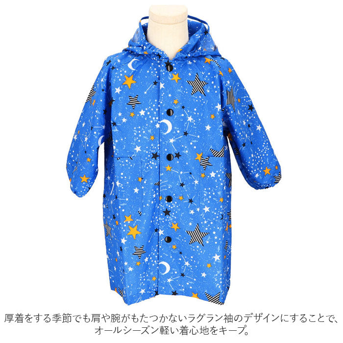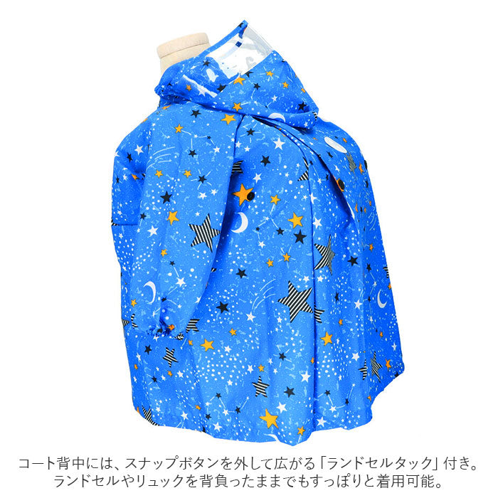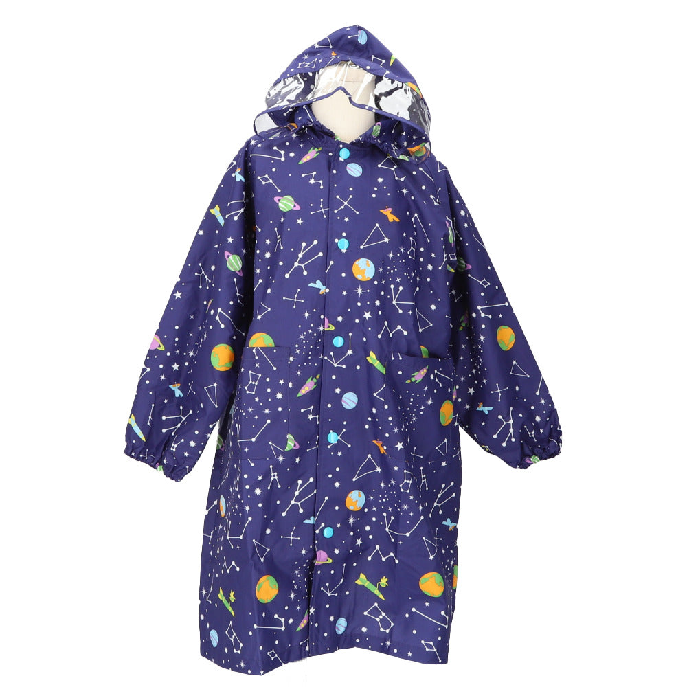 ・ワイルドな恐竜に宇宙に広がる星座など、男の子の夢を生地いっぱいに散りばめたコートで、雨の日も元気にお出掛け♪持ち運びに便利な収納袋付き。