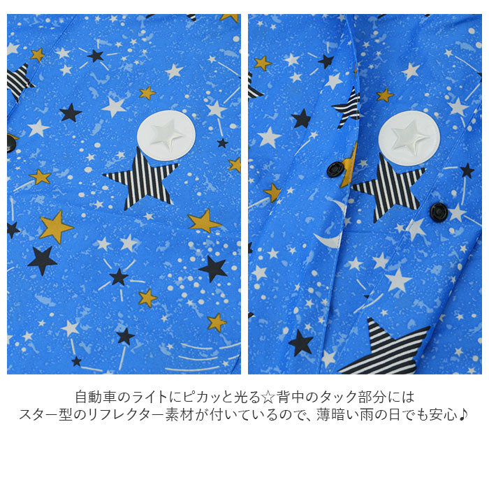 ・自動車のライトにピカッと光る☆背中のタック部分にはスター型のリフレクター素材が付いているので、薄暗い雨の日でも安心♪