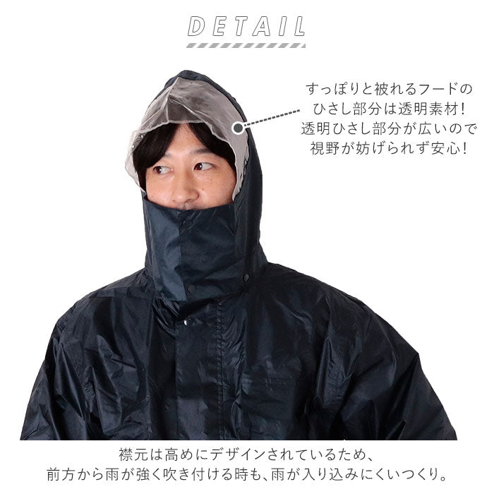 ・すっぽりと被れるフードのひさし部分は透明素材!透明ひさし部分が広くとられているため、前方・左右まで視野が妨げられず安心!(フードは首元のボタンで取り外しが可能)
