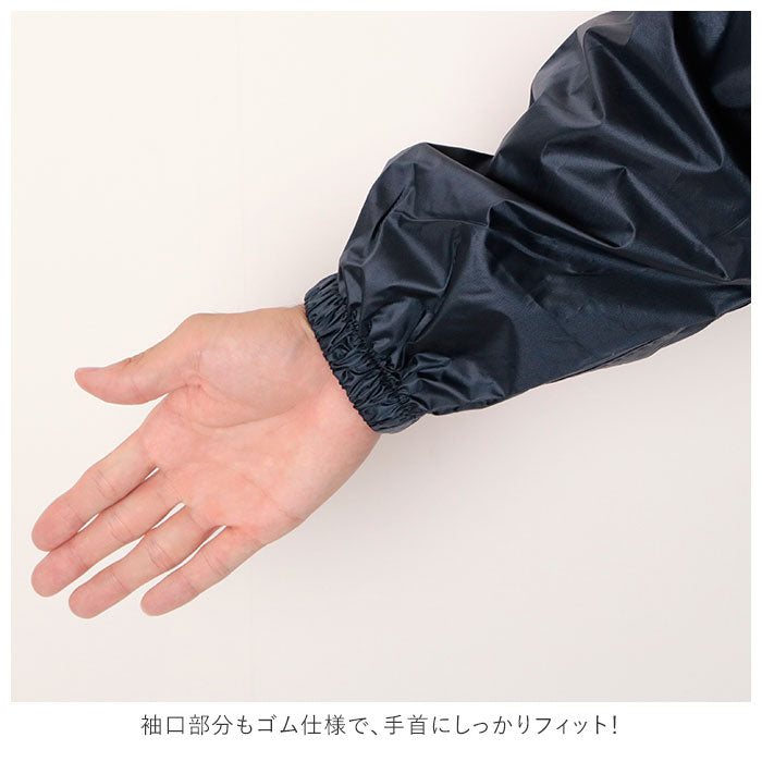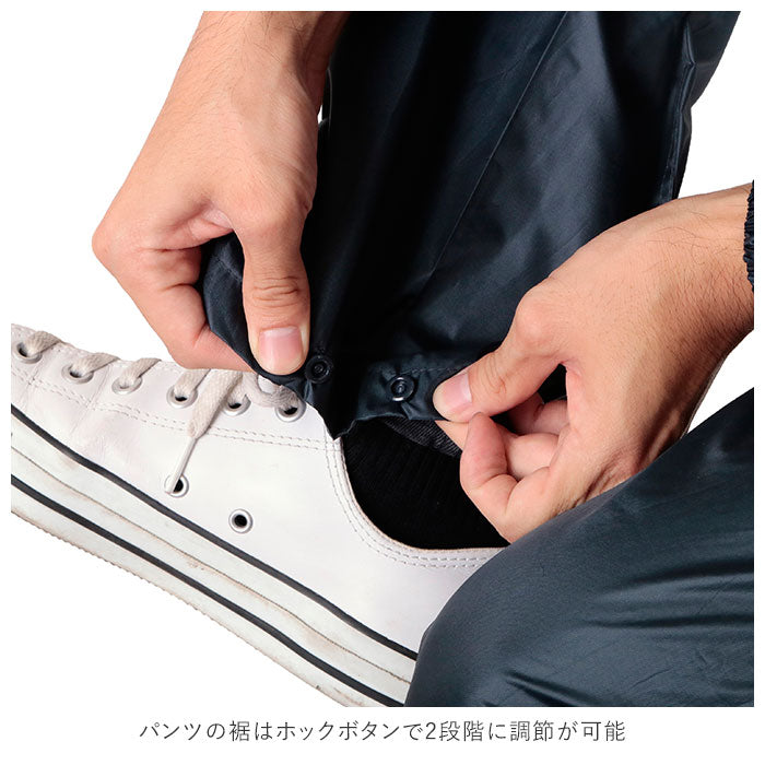 ・袖口部分もゴム仕様で、手首にしっかりフィット!パンツの裾はホックボタンで2段階に調節が可能で、袖口・裾部分の雨の侵入対策もバッチリ。