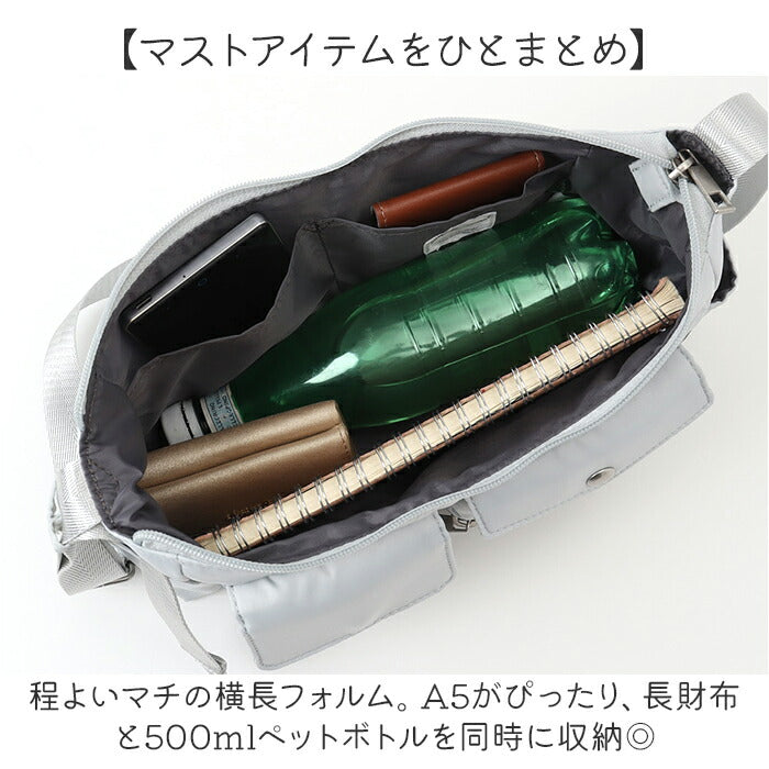 ・程よいマチの横長フォルム。A5がぴったり、長財布と500mlペットボトルを同時に収納◎