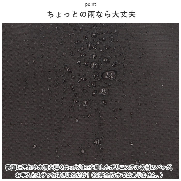 ・表面に汚れや水滴を弾くはっ水加工を施したポリエステル素材のバッグ。お手入れもサッと拭き取るだけ!(※完全防水ではありません。)