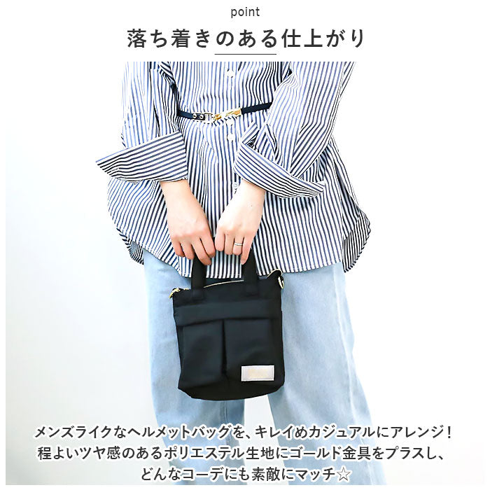 ・メンズライクなヘルメットバッグを、キレイめカジュアルにアレンジ!程よいツヤ感のあるポリエステル生地にゴールド金具をプラスし、どんなコーデにも素敵にマッチ☆