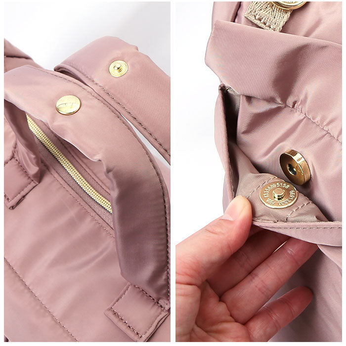 ・手持ちではもちろん!長さ調節可能なショルダーベルトを使って肩掛けや斜め掛けも。お好みに合わせてスタイルチェンジ☆持ち手ハンドルはスナップボタンでまとめることが可能。