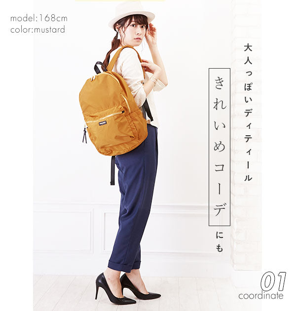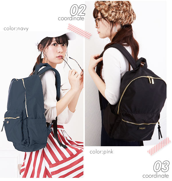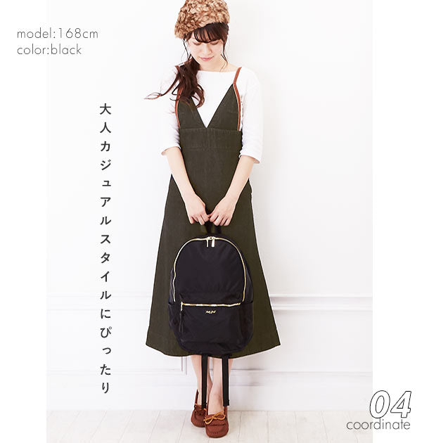 LegatoLargo人気No.1の10ポケットリュックの撥水タイプです。上質感漂う微光沢ナイロン素材で、大人カジュアルスタイルにぴったり。こだわりの10ポケット仕様はそのままに、パーツやネームをゴールドで統一し、ユニセックス寄りなテイストに仕上げました。