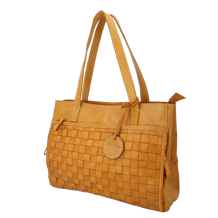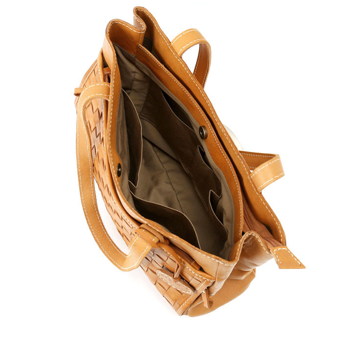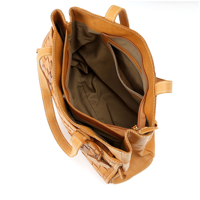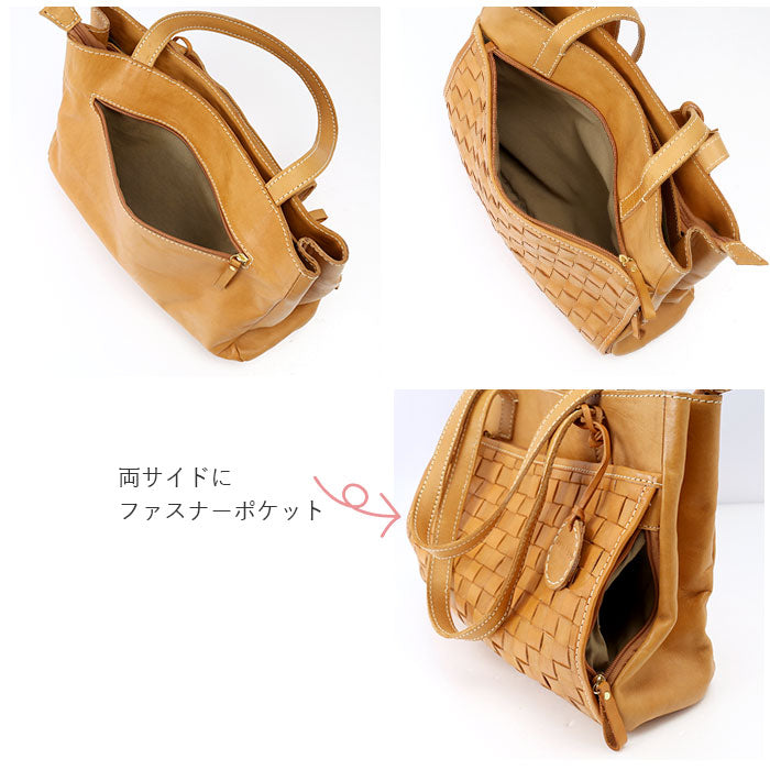 ・バッグ本体全てに、厳選されたナチュラルレザー(牛革)素材を使用。フロントに丁寧に編み込んだメッシュ加工生地を施し、カチッと落ち着いた雰囲気に仕上げたレザートートバッグ。