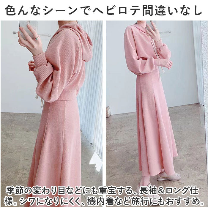 ・季節の変わり目などにも重宝する、長袖&ロング仕様。シワになりにくく、機内着など旅行にもおすすめ。
