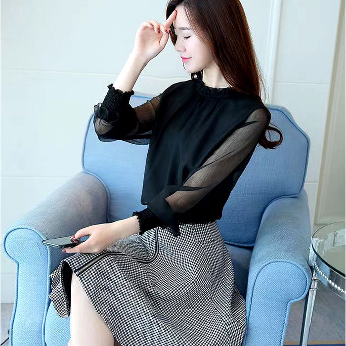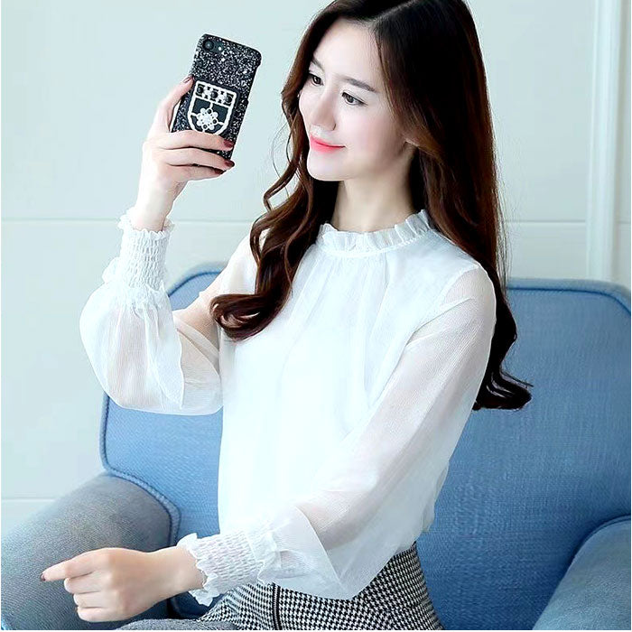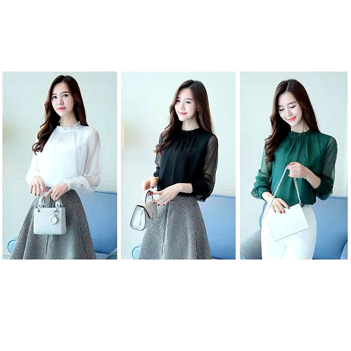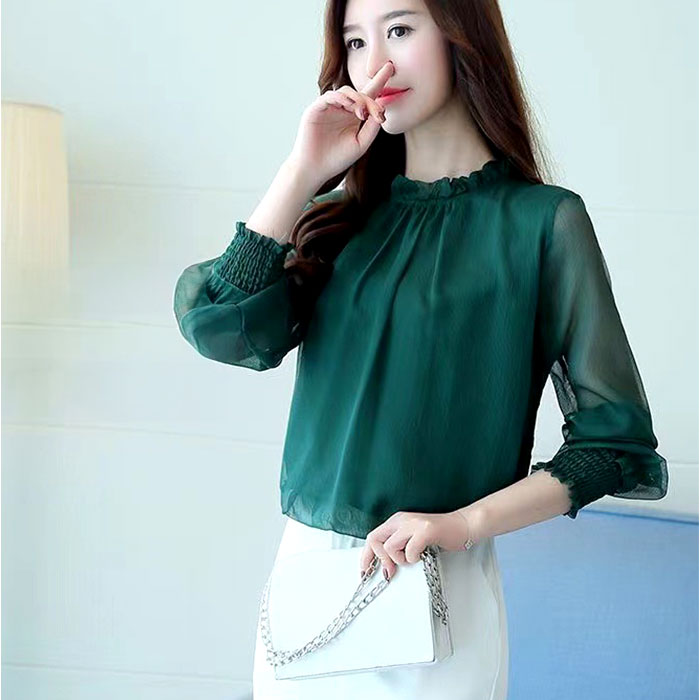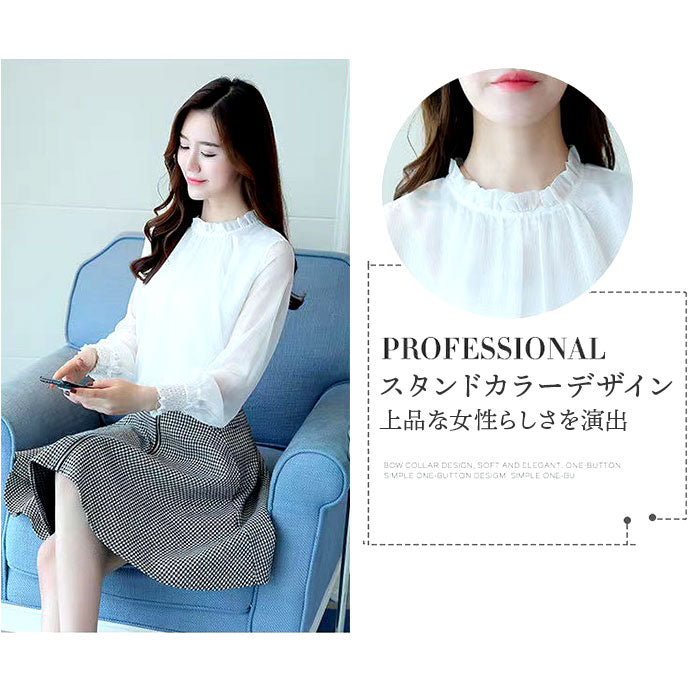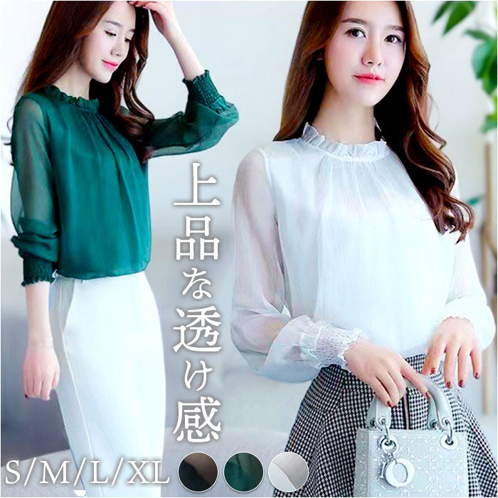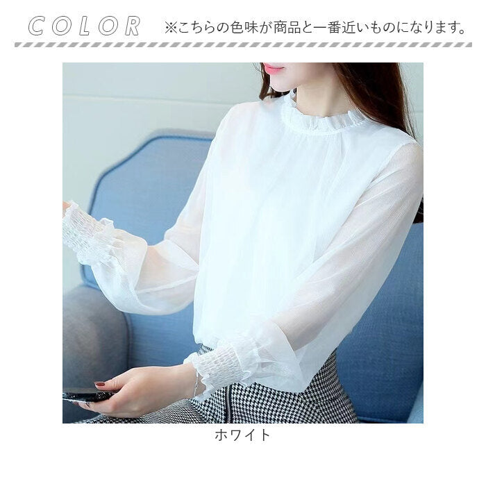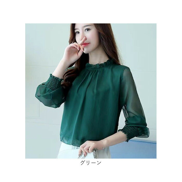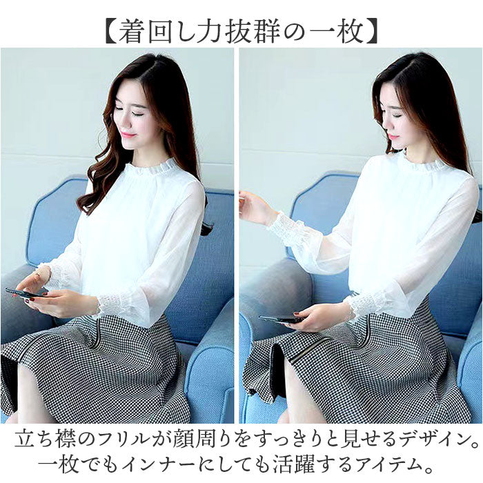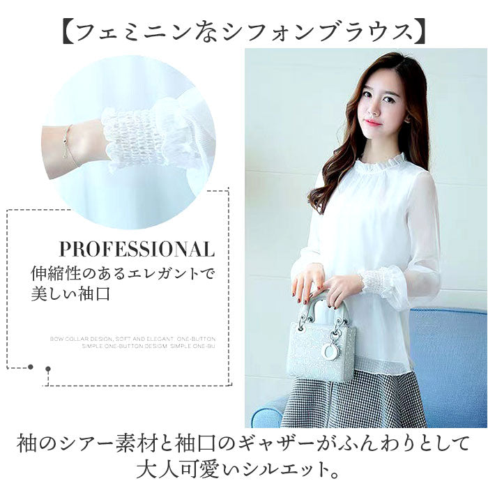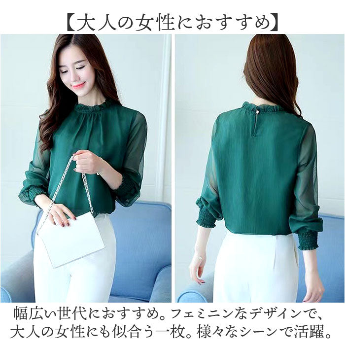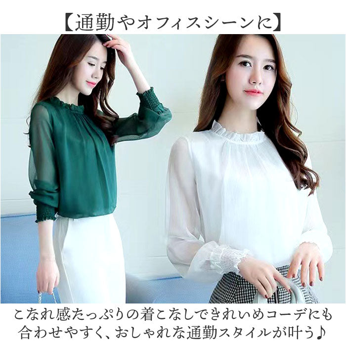 レディース シフォンブラウス 長袖 通販 ブラウス シャツ フリルブラウス 立ち襟 カットソー トップス きれいめ おしゃれ シアー 透け感 ハイネック ふんわり シンプル 無地 フォーマル