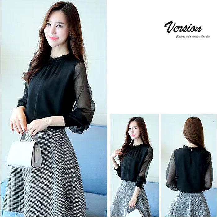 ・立ち襟のフリルが顔周りをすっきりと見せるデザイン。一枚でもインナーにしても活躍するアイテム。