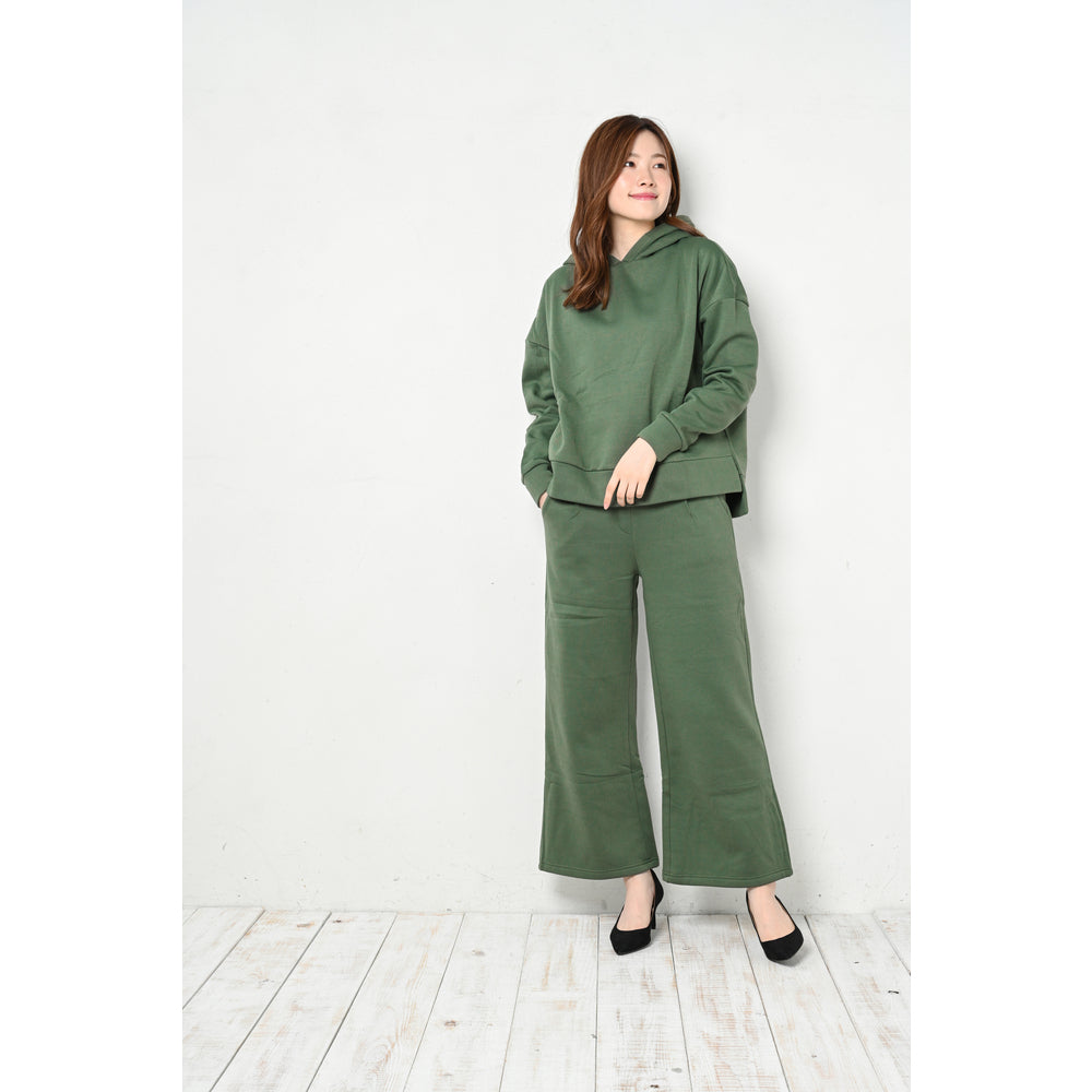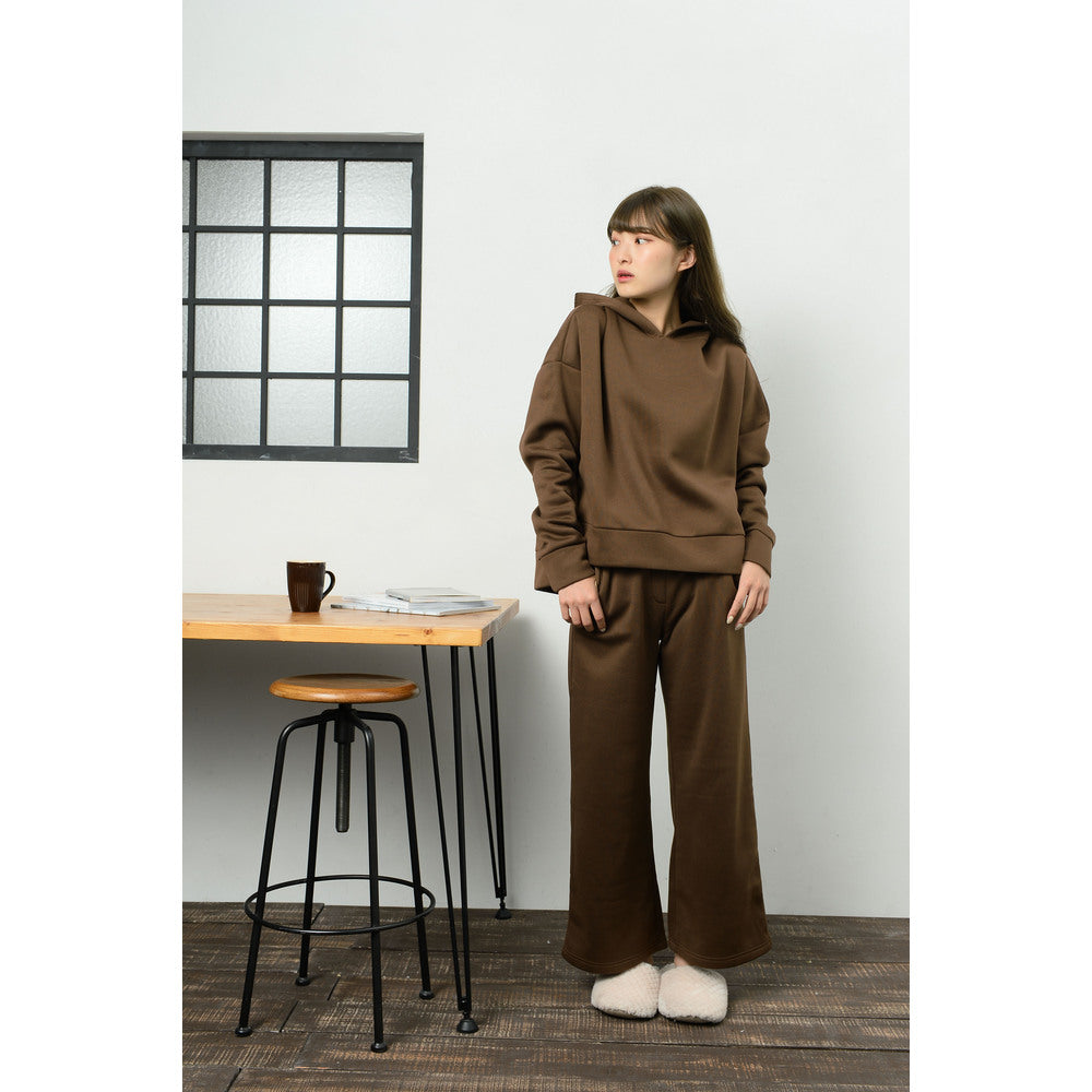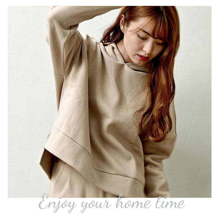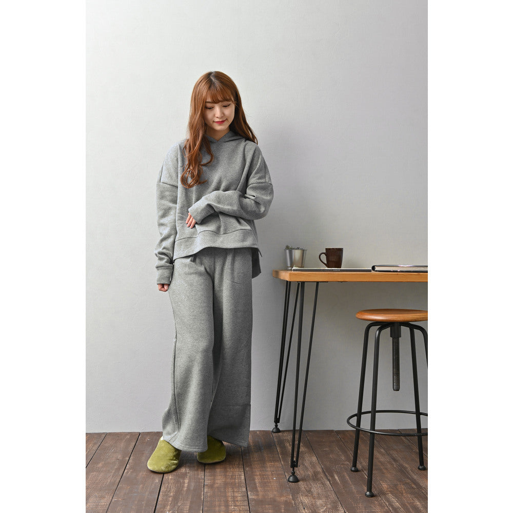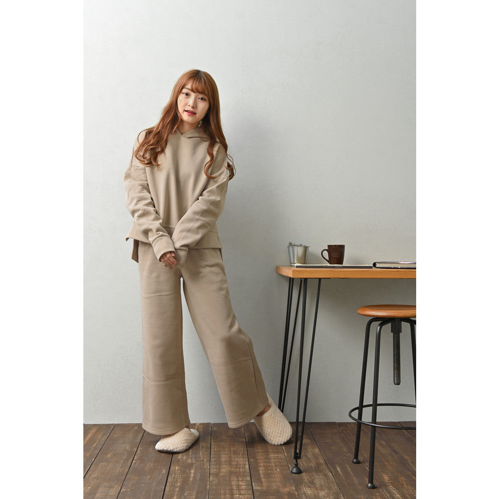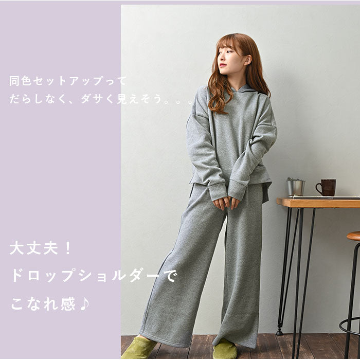・ドロップショルダーがキュートなフード付きトップスと、ゆったりワイドパンツのセットアップが発売。