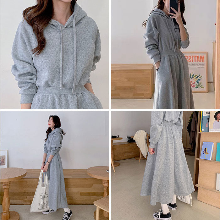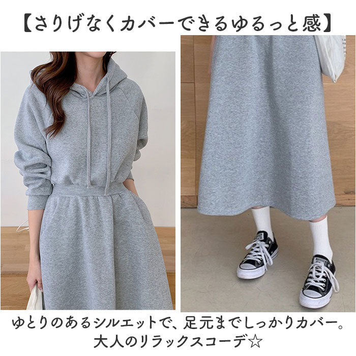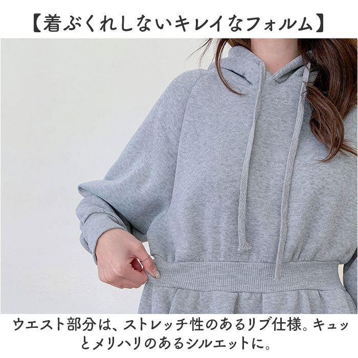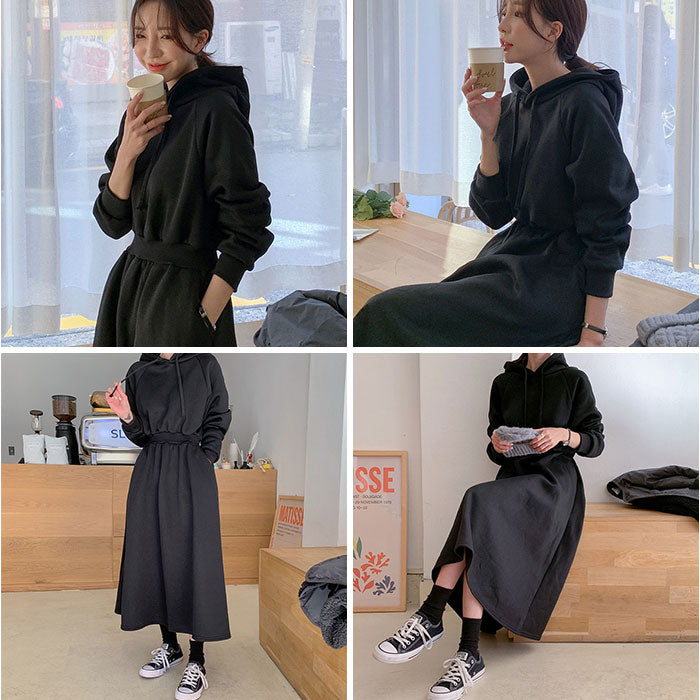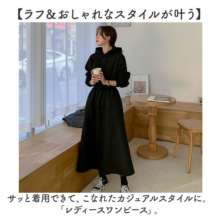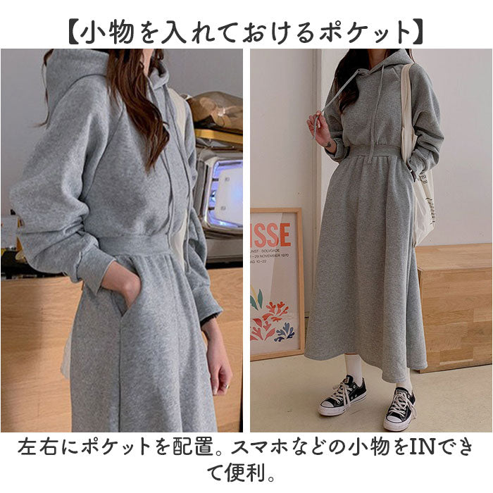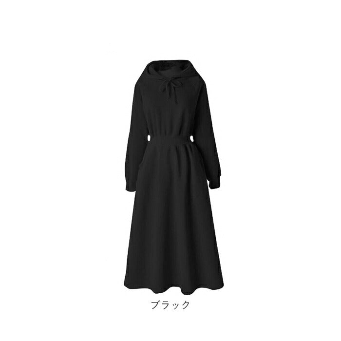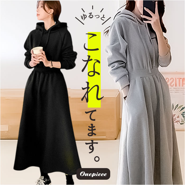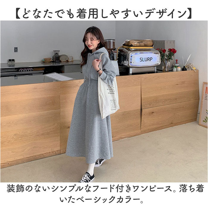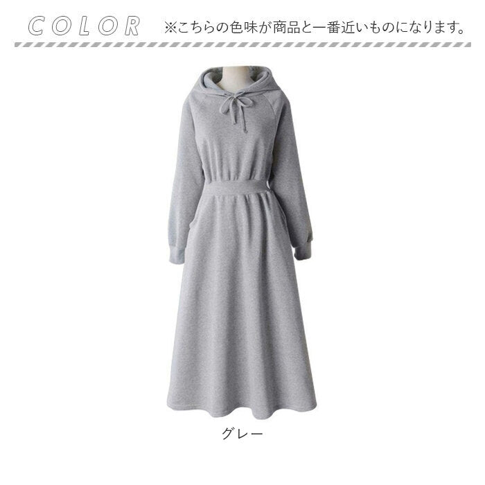 ・装飾のないシンプルなフード付きワンピース。落ち着いたベーシックカラー。