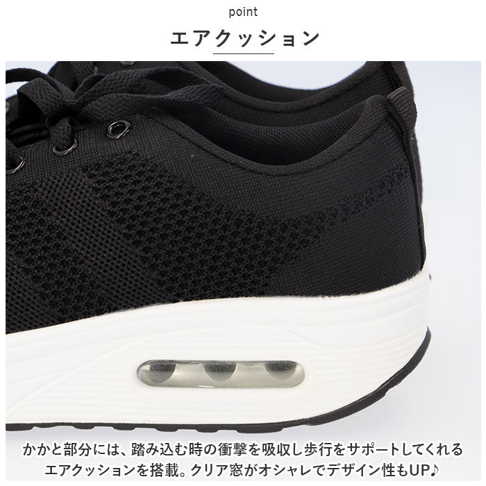 ・かかと部分には、踏み込む時の衝撃を吸収し歩行をサポートしてくれるエアクッションを搭載。クリア窓がオシャレでデザイン性もUP♪