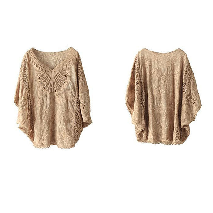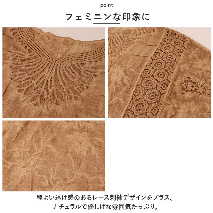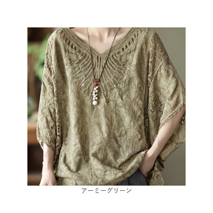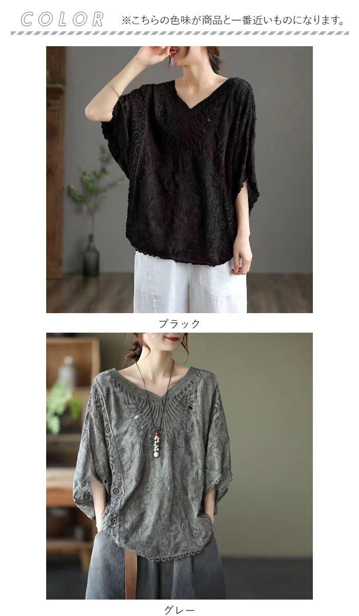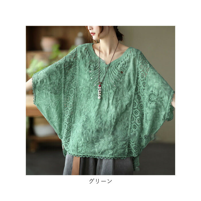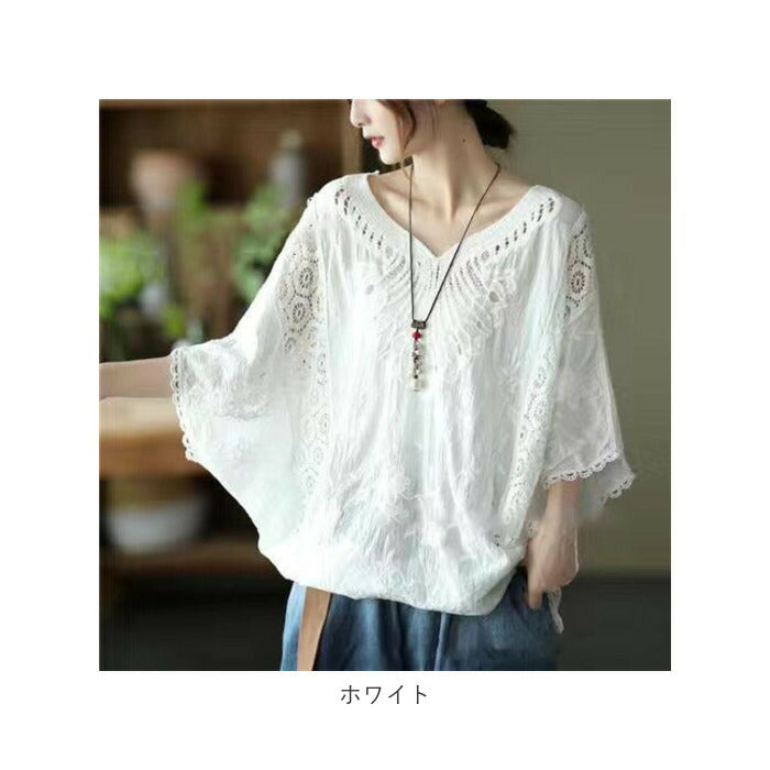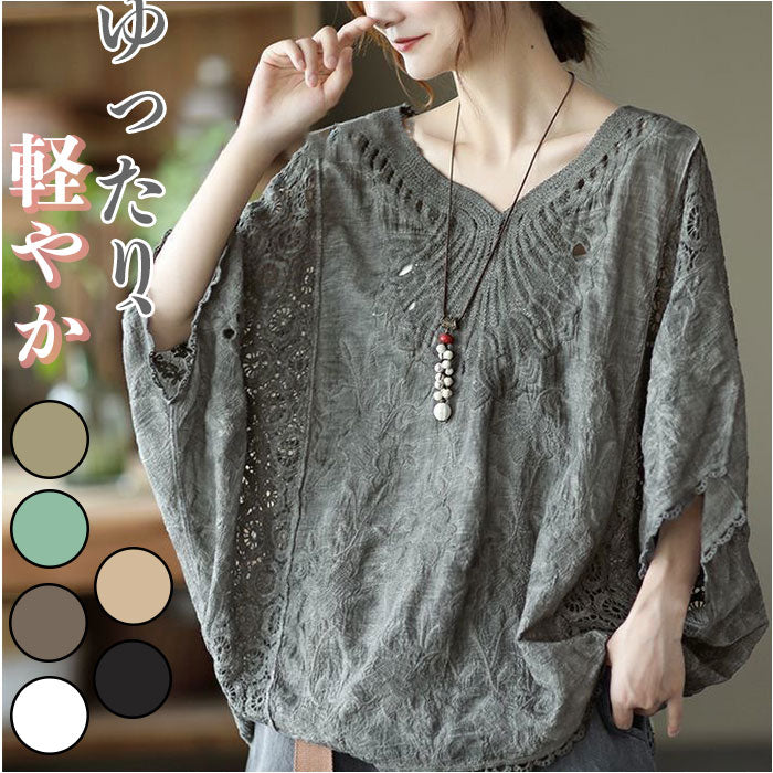 レース トップス 半袖 通販 ブラウス レディース 刺繍ブラウス Tシャツ プルオーバー ゆったり 春夏 刺繍 ドルマン 春 可愛い 夏 体型カバー 大きいサイズ 綿 コットン ボリューム袖