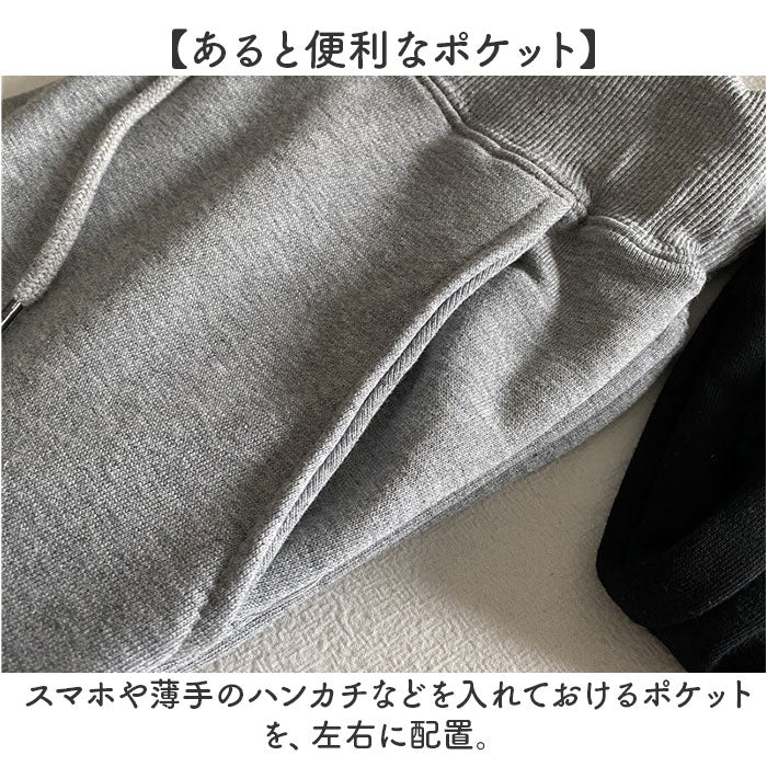 ・ウエストは幅広ゴムと紐で締め付け感なし!伸縮性のあるスウェット素材でのびのびラクラク。
