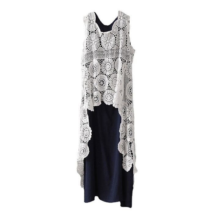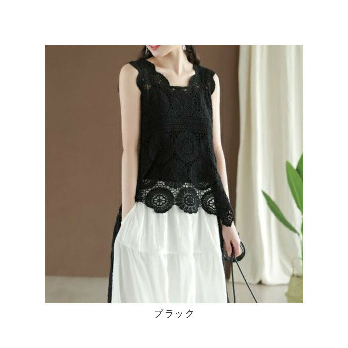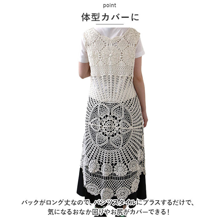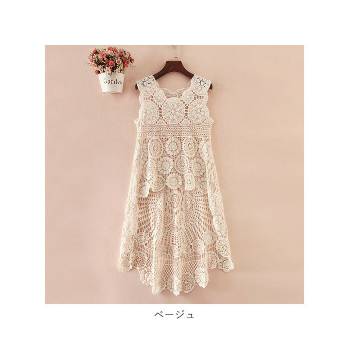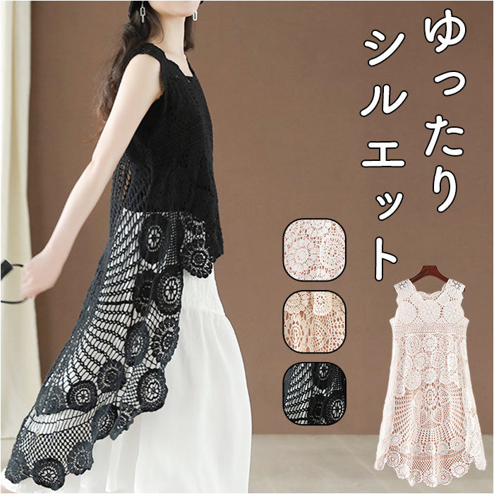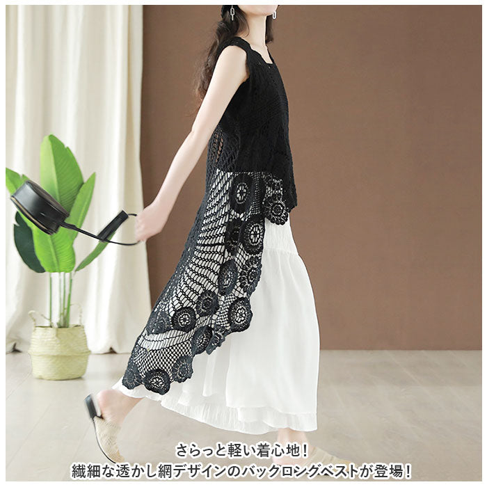 ワンピース ベスト ロング丈 通販 レディース 羽織り 重ね着 レイヤード ノースリーブ 総柄 ロング ニット カジュアル 春 夏 透かし編み おしゃれ かわいい